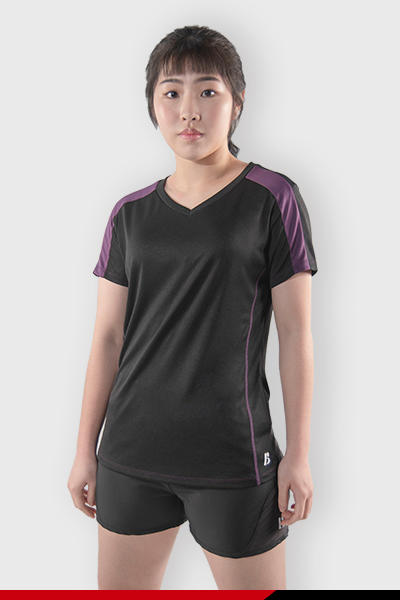 女性實穿短袖短褲運動服,超柔運動短袖T恤-紫、網眼拼接運動短褲-黑